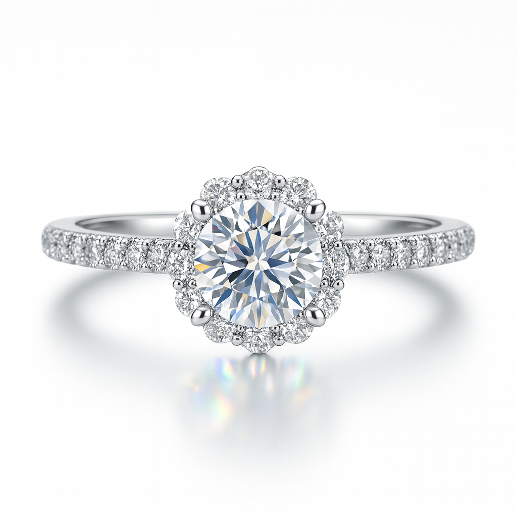 ラウンドブリリアントカットのダイヤモンドを中心に、花が咲き誇るようなヘイローデザインを施したリング。アームとヘイローにセッティングされたメレダイヤモンドのサイズを変えることで、繊細で立体的な輝きが生まれ、可憐な印象を演出します。華奢なアームと台座の高さを抑えることにより、日常の装いにも自然に溶け込みつつ、手元に華やかな存在感を添えます。